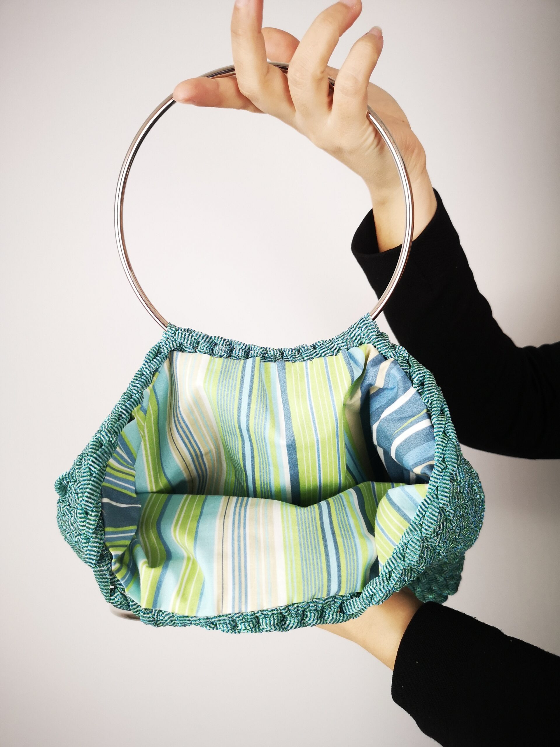bolso tejido a crochet en color turquesa con destellos brillantes, anillas en acero y forrado con tela de rayas.