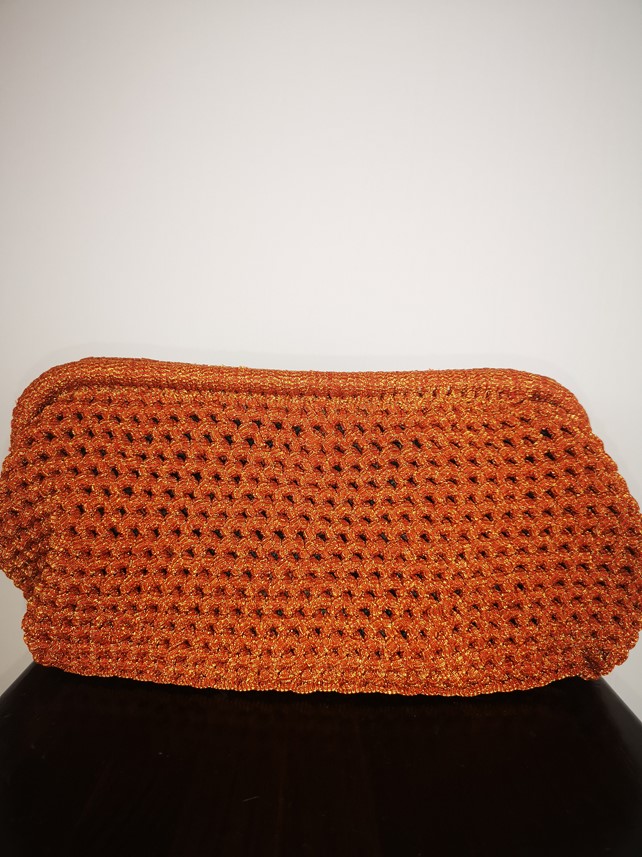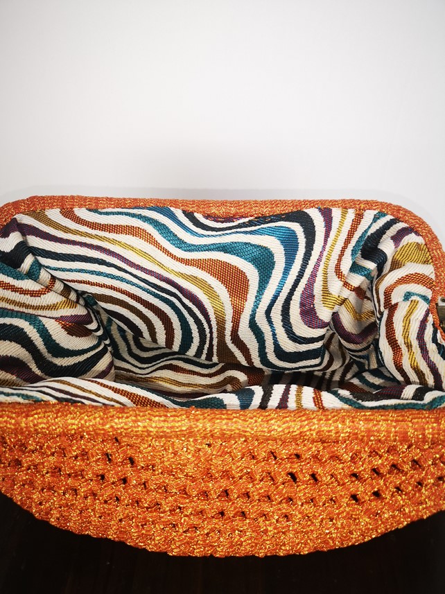 Bolso de mano tejido a crochet en color naranja, forrado con tela multicolor y con cierre de boquilla invisible.