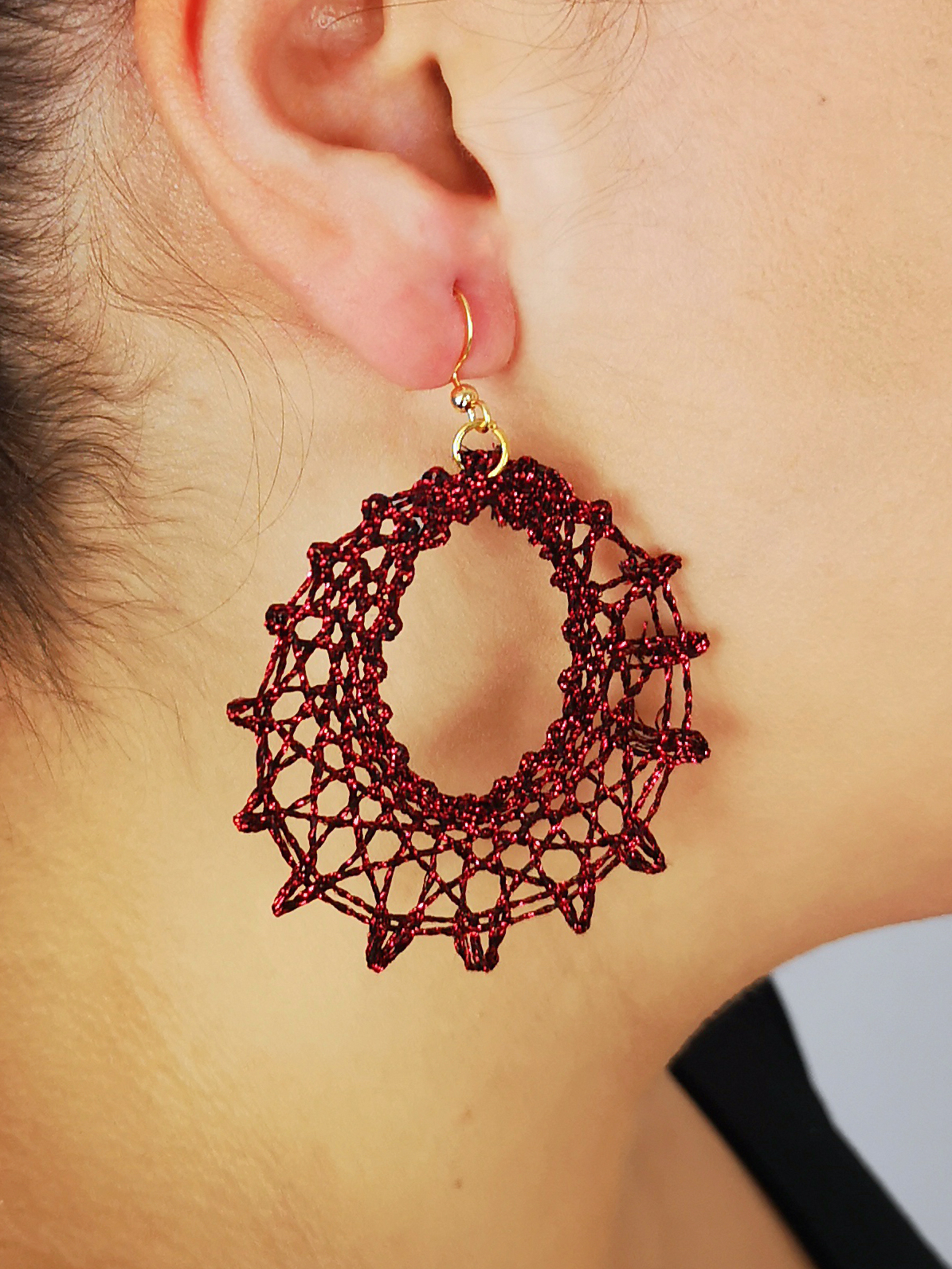 Pendientes realizados en encaje de bolillos con hilo metalizado en tonos rojo oscuro y negro con enganches de acero.