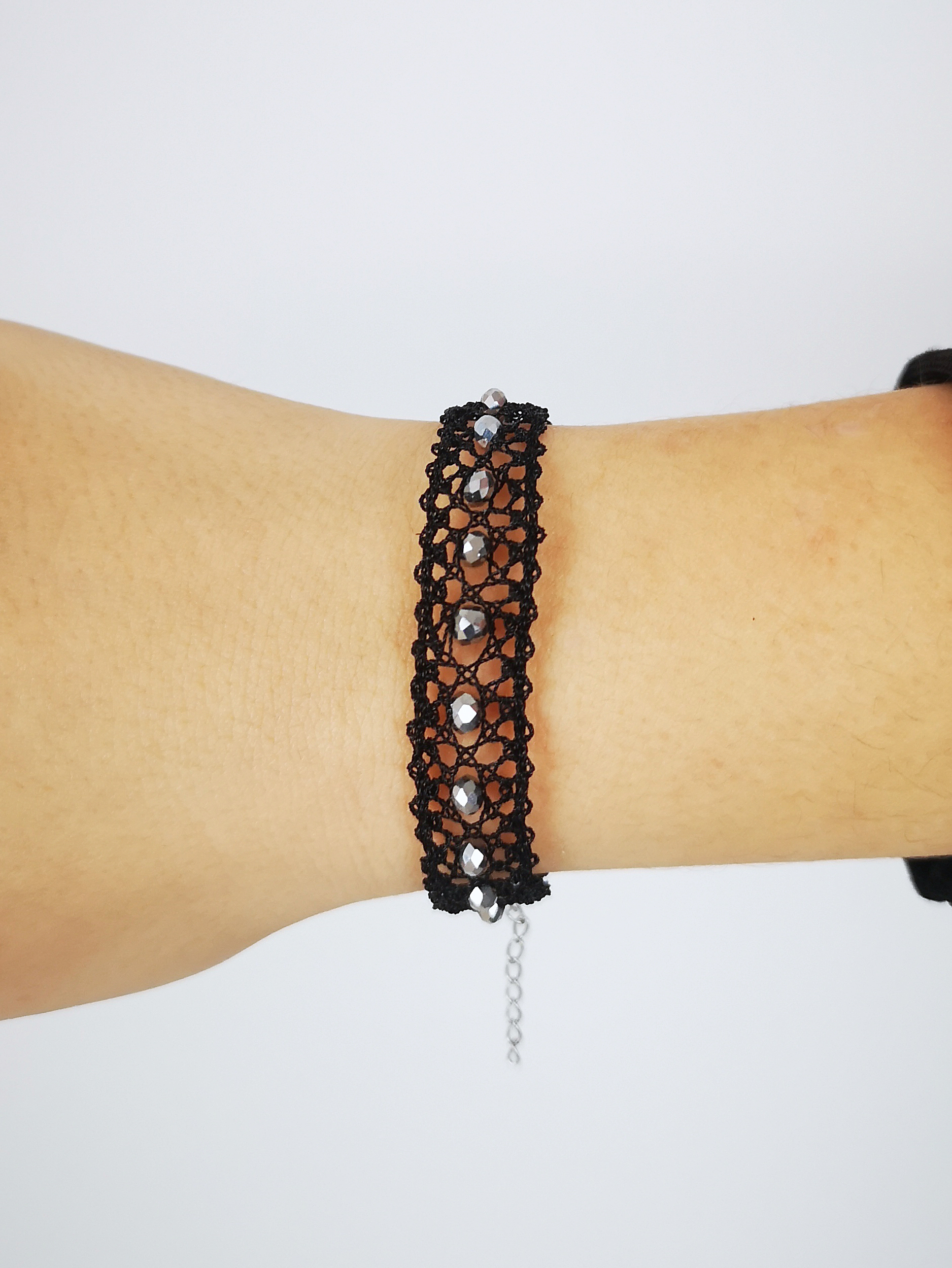 Pulsera realizada en encaje de bolillos en color negro con cristales facetados en tonos plata y con cierre de acero.
